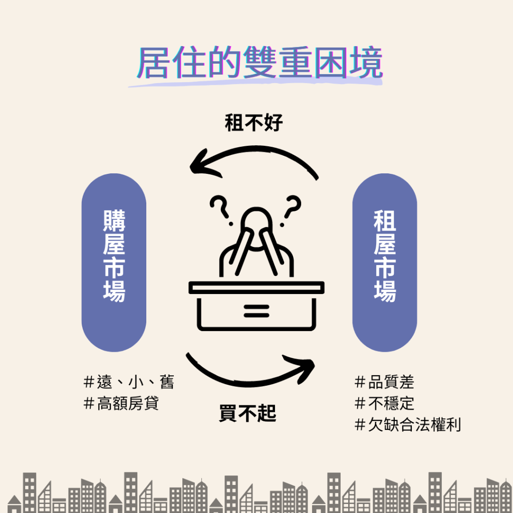 而在房價高漲、租屋品質低落的情況下,台灣青年往往在購屋市場、租屋市場間陷入兩難。既難以取得購房的經濟資源,又無法在小而不透明的租屋市場中,尋找良好的安身之處。只能在購屋市場與租屋市場之間不斷遭受擠壓。
