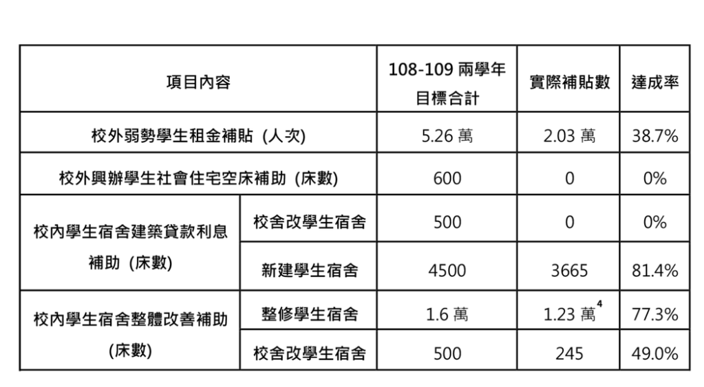 - 應針對既有改用、整修及新建宿舍之補助機制,設定明確的標準與績效指標,優先鎖定相對嚴峻不足學校,並列為大學評鑑與相關經費補助重要依據之一,方能調動各校積極性,確保資源投入之效益。