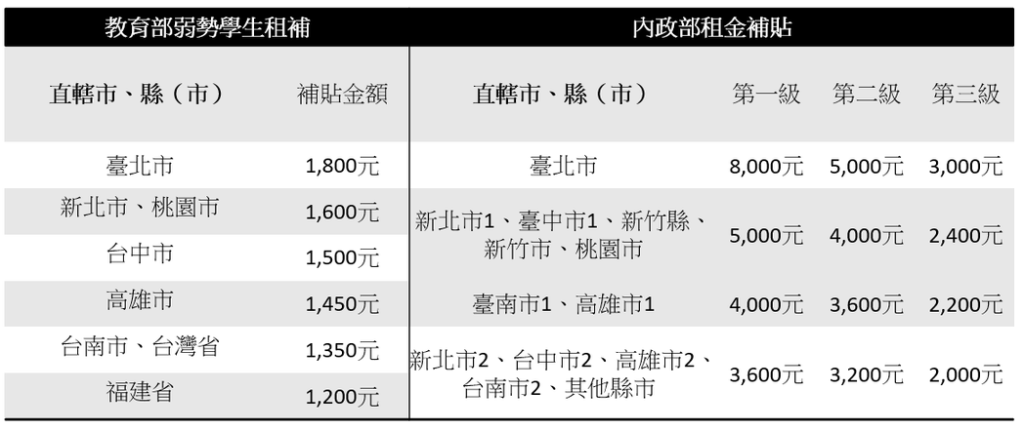 - 第一類弱勢戶政府提供簽約租金12.5%、第2類弱勢戶提供簽約租金37.5%租金差額補助。 ↩︎