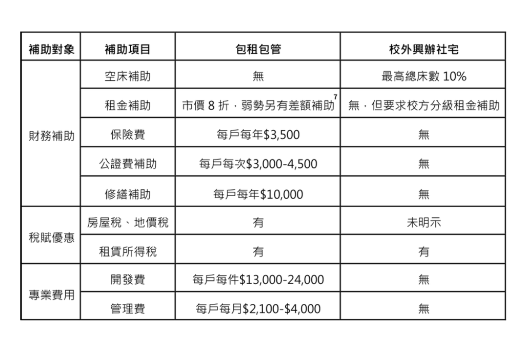 再來討論「校外興辦學生社會住宅空床補助」,其概念類似包租代管,由學校擔任包租代管業者,承租校外住宅並轉租給學生使用。補助方式為最高補助學生社宅空床總床數之10%,每床每學期補助上限一萬元,條件為「出租率達八成以上」、「學校向所有權人租賃期間及興辦學生社會住宅期間皆在三年以上者」。