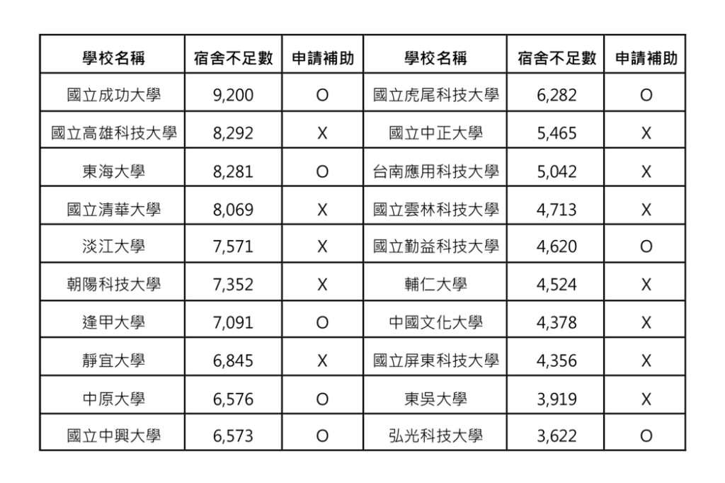 - 「宿舍不足數」採用高教工會(2017)所提估算方式:(住宿提供數)-(住宿需求總人數)。住宿提供數包含「校內宿舍+BOT宿舍+學校向外承租宿舍」,住宿需求總人數包含「學生住宿人數+校外租屋學生數+學校向外承租宿舍」。由於「學校向外承租宿舍數」並未標明入住狀況,以住滿計算,其佔所有宿舍約5%比例,應不影響結果。 ↩︎