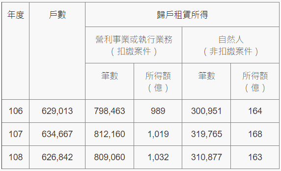 要評估政府掌握多少市場租屋事實,最直接的數據莫過於「有多少房東申報了租賃所得稅」。依財政部提供的數據(詳「核定房屋租賃所得統計表」),2019年全國有626,842戶(房東)申報了租賃所得稅,其中出租予「營利事業或執行業務者」的扣繳件數為809,060件,出租予「自然人」的非扣繳案件數則為310,877件。