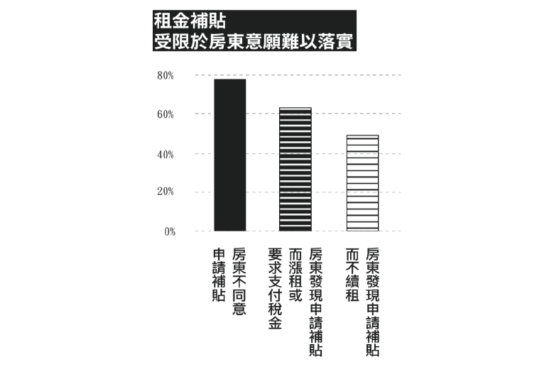 租金補貼也是如此,根據社會住宅推動聯盟於2020年針對六都第一線社工進行「政府住宅資源運用與需求調查」,當問到為何仍有許多弱勢未申請租金補貼,社工們依據其實際服務勾選的前三大原因分別為「房東不同意個案申請補貼(78.6%)」、「房東發現個案申請補貼而漲租或要求支付稅金(62.6%)」、以及「房東發現個案申請補貼而不續租(51.9%)」,皆與租屋黑市下房東不想租屋事實曝光有關。