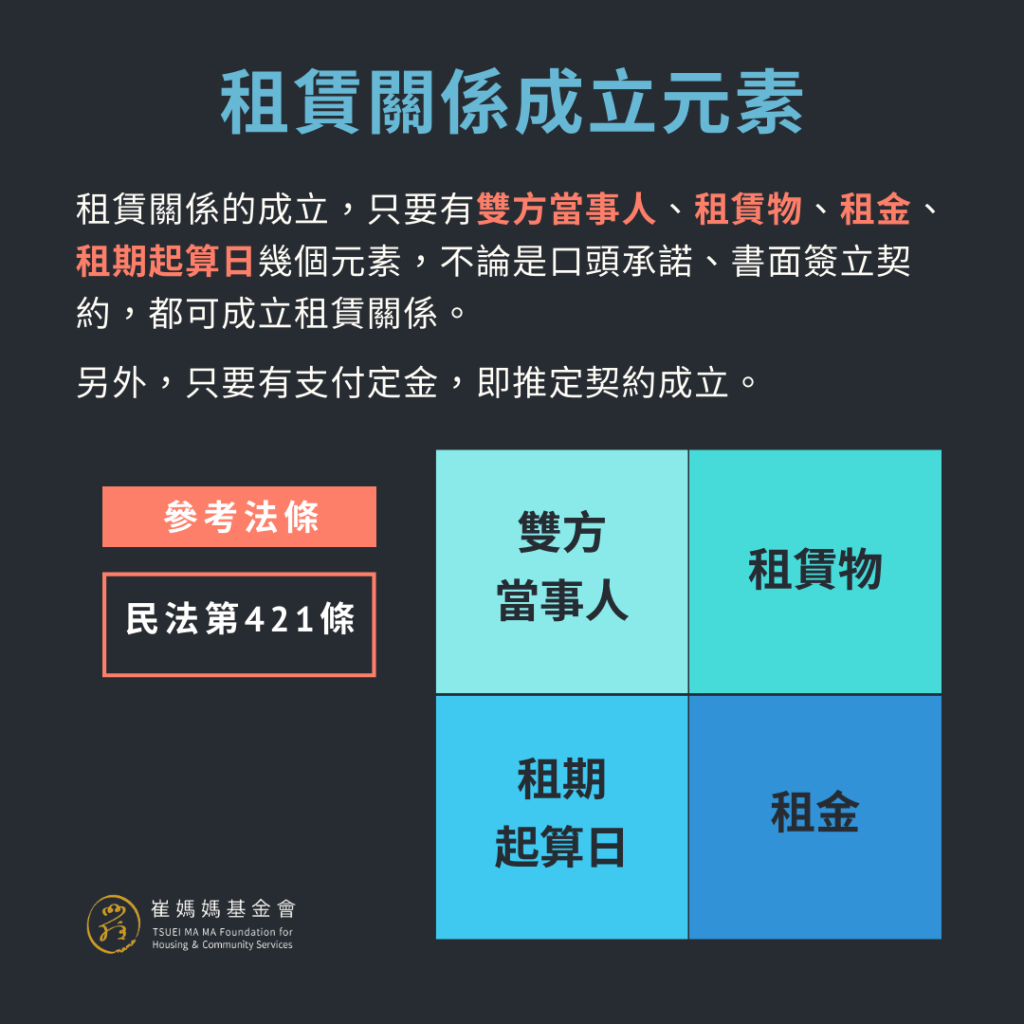 根據《民法》第421條規定,只要有雙方當事人、租賃物、租金、租期起算日等四大元素,不論是口頭承諾、簽立書面契約,都可成立租賃關係。