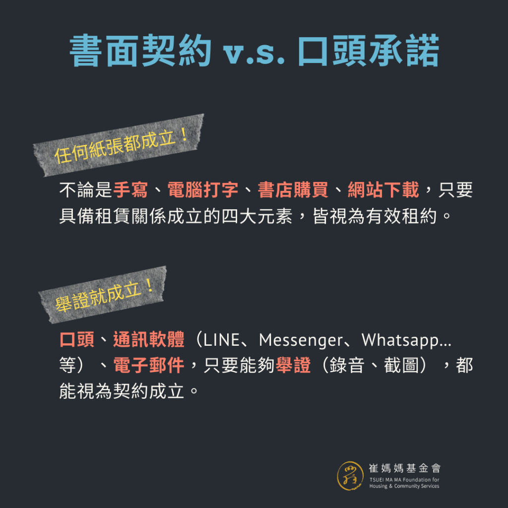 而且書面契約不管是自己在任何紙張上手寫的、書局買的、或是網路上下載的,只要具備租賃關係的成立要素,以及沒有違反「住宅租賃定型化契約應記載及不得記載事項」,都是有效的租約。