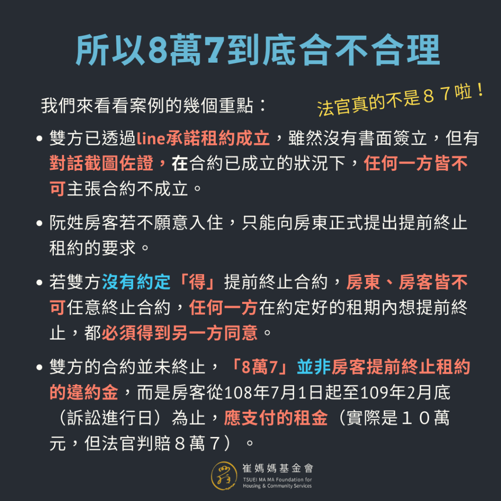 - 雙方的合約並未終止,「8萬7」並非房客提前終止租約的違約金,而是房客從108年7月1日起至109年2月底(訴訟進行日)為止,應支付的租金(實際是10萬元,但法官判賠8萬7)。